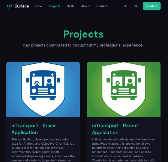 Développée à la base en native puis l'année passée en React Native, cette application permet aux parents de suivre les trajets de leurs enfants, de recevoir des notifications en temps réel et d'accéder à des informations sur les itinéraires et les horaires.